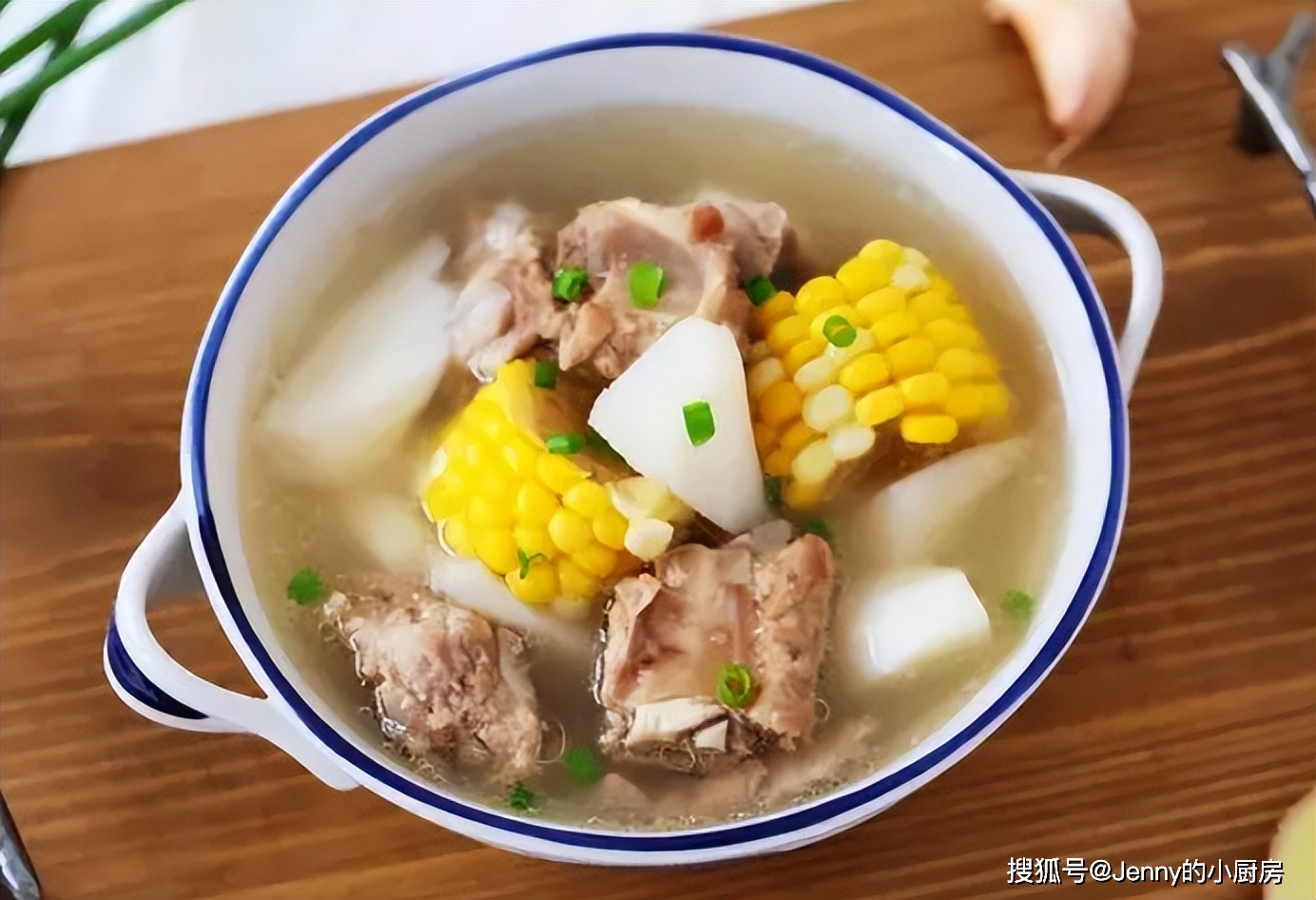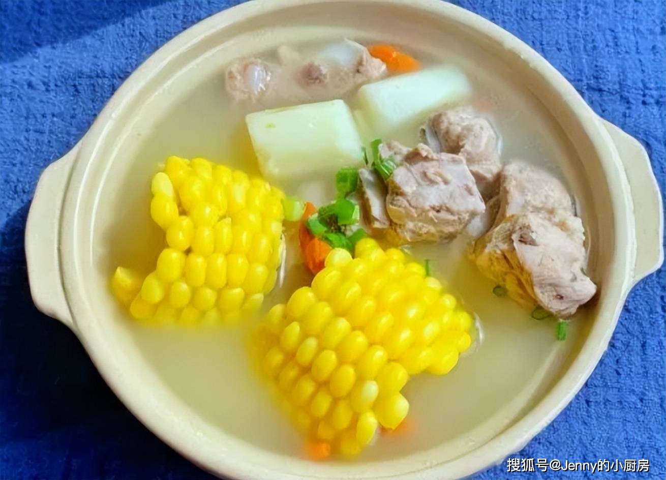 時間到後,看看排骨的狀態,若還有些硬,可以延長時間。燉好後,去掉蔥結,再放入山藥塊、玉米塊,繼續燉二十分鐘。