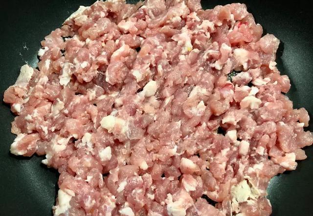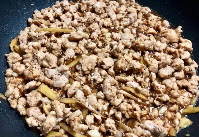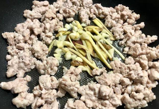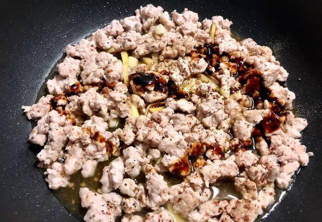 2、鍋不用再放油,放(絞肉)中小火慢慢蓋鍋煸6分鐘。豬絞肉炒至微金黃後放(蒜、薑)用絞肉煎香冒出的油爆香。聞到蒜薑香氣,拌炒一下,絞肉炒香再加米酒燒燉出肉甜,加(米酒、醬油、五香粉、白胡椒粉)翻炒均勻。