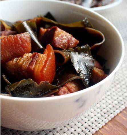 1、五花肉洗凈,切成麻將大小的塊備用;海帶切成三角形,入沸水中煮兩分鐘;瀝幹並放在一邊;燒開半鍋開水,備用;