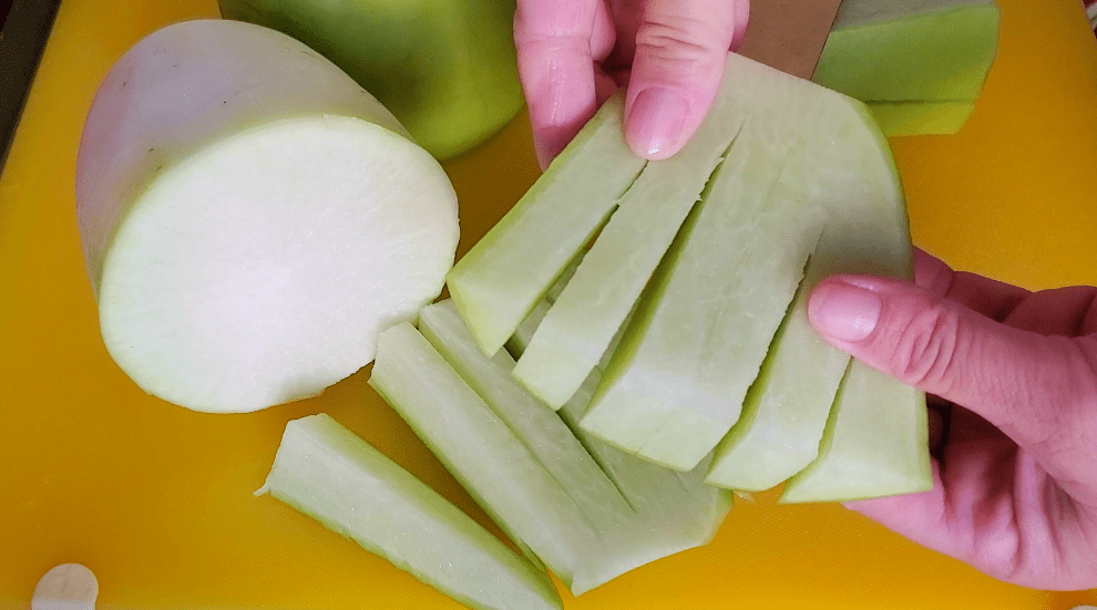 【具體制作步驟】:1、新鮮的大蘿卜清洗幹凈白哦面的灰塵,坑坑窪窪的地方容易藏污納垢,用刀削一削,清洗幹凈後瀝幹水分,切成段,再切成片,然後切成條,頂部不要切斷,如上圖所示,這樣方便晾掛。