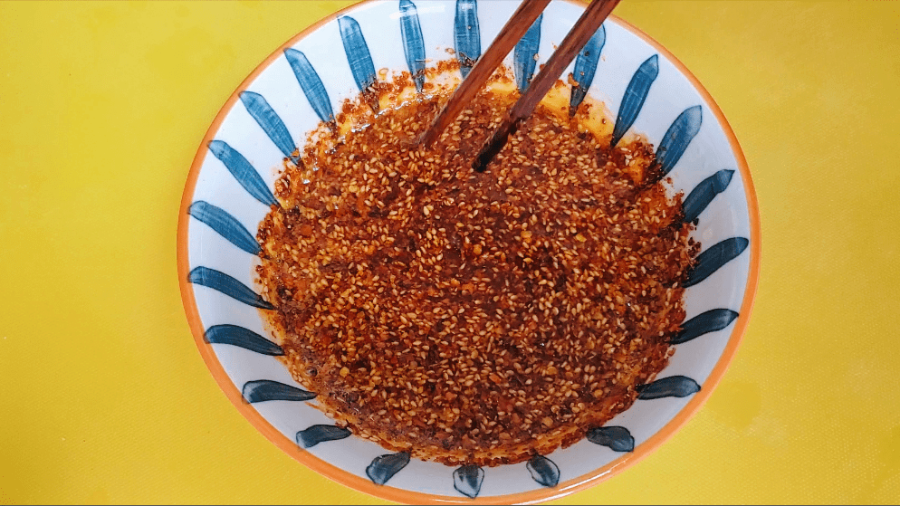 7、香辣蘿卜幹好吃的關鍵,就是這個又香又辣的油潑辣子,空碗中加入40克的粗辣椒粉,20克的細辣椒粉,一大勺的芝麻,少許的鹽能使做出來的辣椒油更好吃,分3次倒進滾油激發出辣椒的香味,如果滾油一次性倒進辣椒粉上,不但容易讓辣椒粉炸糊,做出來的辣椒油還有發苦的味道,最後攪拌均勻,拌啥都好吃的油潑辣子就做好啦。