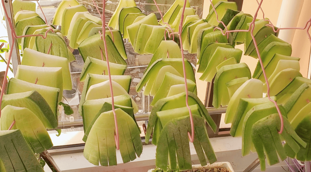 2、如果光照好,可以把切好的蘿卜加鹽醃制1天1夜,醃制出水分,這樣能去去蘿卜的辛辣味,吃起來更脆爽,然後再清洗幹凈,放到晾衣架上,放到陽光充足,通風幹燥的地方晾3~5天。