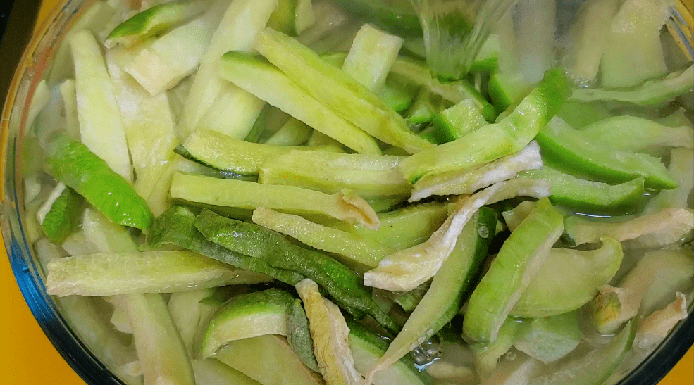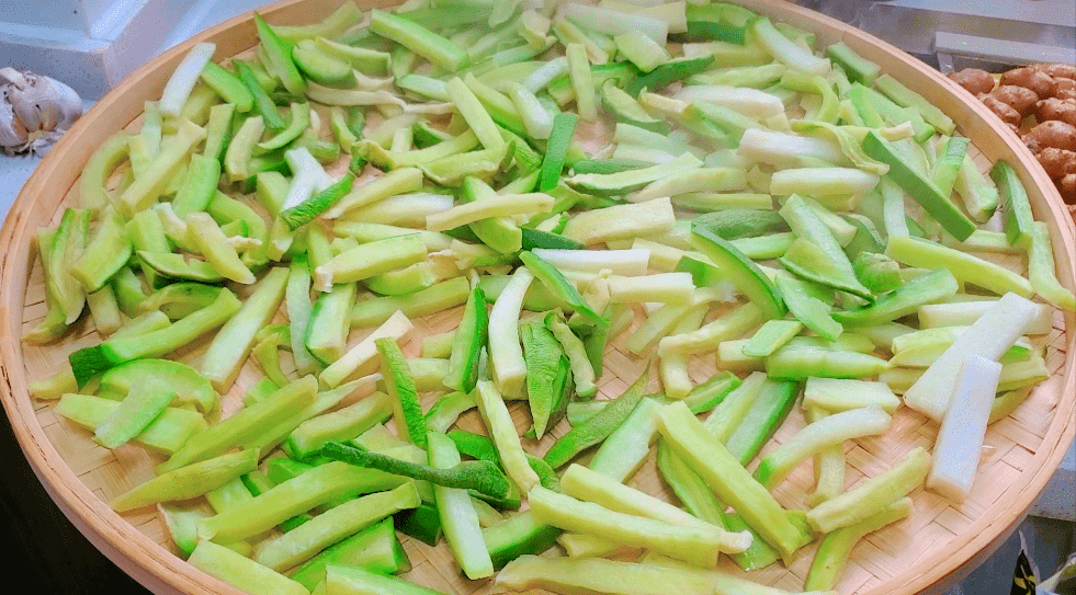 5、晾曬瞭5天,蘿卜幹表面難免有灰塵,半個小時後,水溫也下降瞭,也不燙手瞭,然後把蘿卜幹搓洗幹凈,放到篦子上攤均勻,晾幹表面的水分,這一步是蘿卜幹脆爽的關鍵。