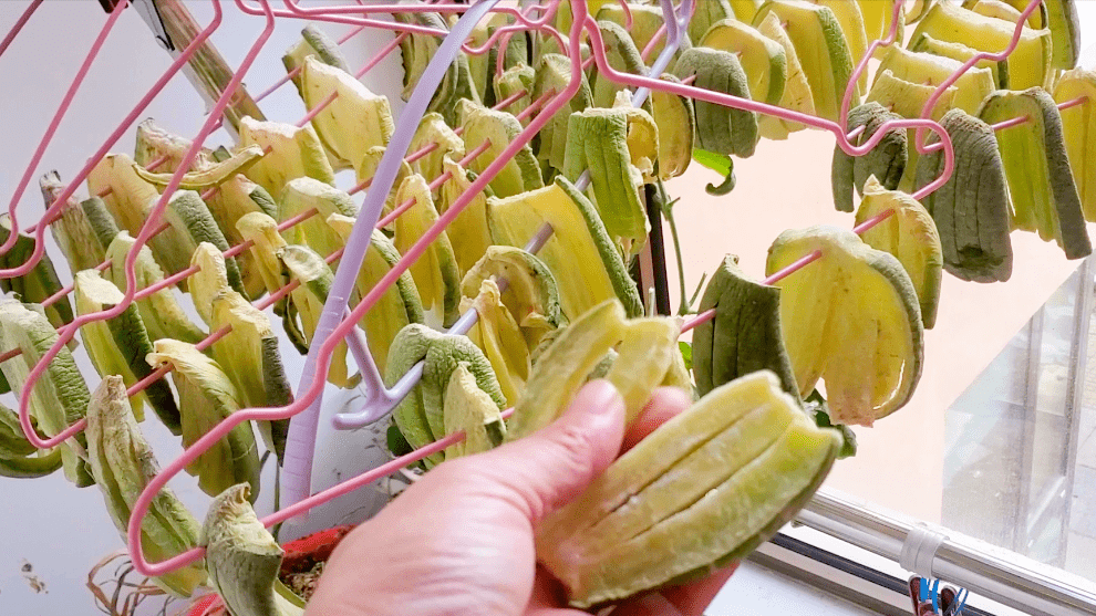 3、經過3~5天的晾曬後,蘿卜幹變得非常有彈性,用掰也掰不斷,也就是八成幹的時候就可以瞭,如果想吃更脆爽的蘿卜幹,還可以繼續晾幾天,直到達到自己喜歡的效果就好。