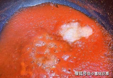 第三步:將打發好的番茄泥放入不粘鍋中,小火慢煮,加入冰糖、白糖和鹽,不斷攪拌,直至糖完全溶解。