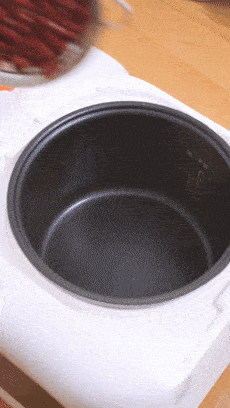 紅豆提前浸泡4個小時,再倒入電飯鍋中,加足量的清水,開啟煮飯模式。記得一定要提前浸泡紅豆,這樣才能更快煮熟煮透煮出沙。