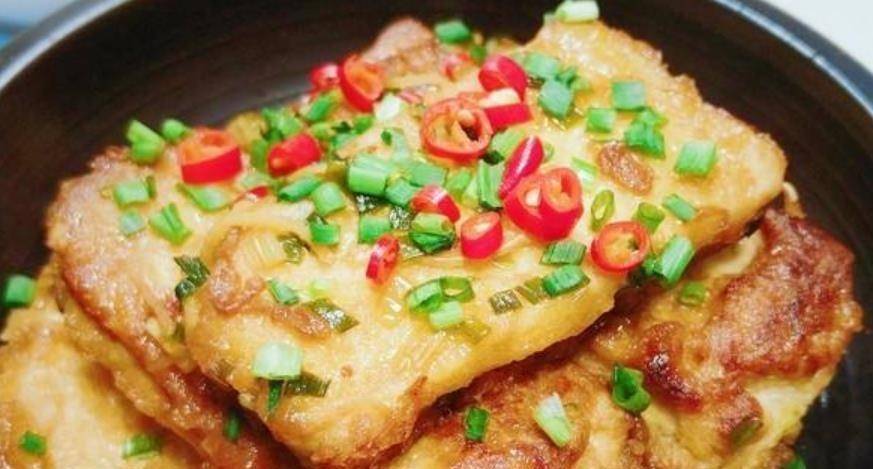 第二步,鍋中熱油,將豆腐裹上淀粉,再裹上雞蛋液,煎至豆腐兩面金黃。倒出並放在一邊。