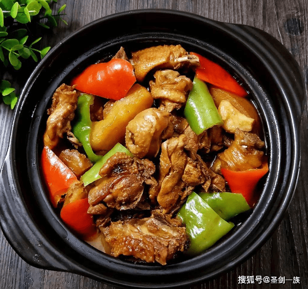 3、加入胡椒粉、食鹽調味,倒入適量開水沒過雞塊,放入幾顆冰糖,放入香菇,蓋上蓋子燉20分鐘。雞肉燉熟後放入青紅椒,轉大火翻炒收汁,青紅椒斷生後即可出鍋。