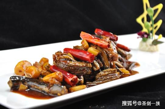 2、鍋上火放入豬油和熟菜油燒至六成熱時,下大蒜爆香,放入辣妹子醬和小米椒節,再放入鱔段大火翻炒,烹入啤酒燒約2 分鐘至鱔段熟時,放鹽、味精、雞精、白糖、老抽和花椒面調味。最後放入子薑絲和芹菜節翻炒均勻,起鍋裝盤即成。