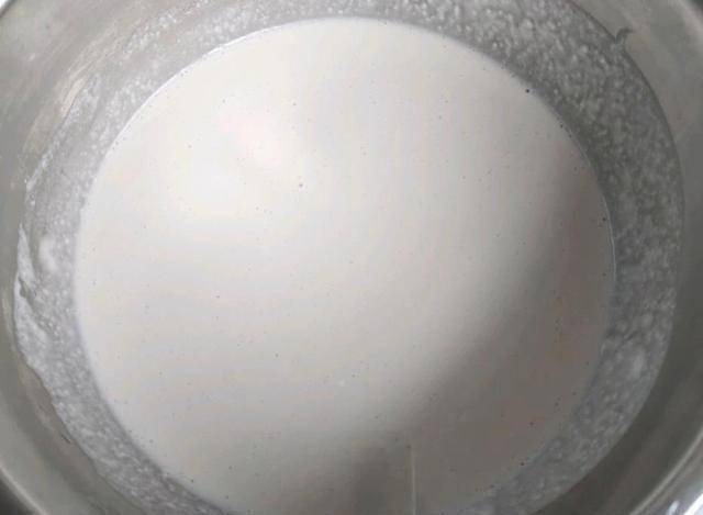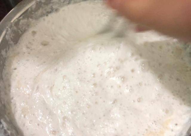 第二步:將米漿濾入大碗中,然後加入3克酵母粉和一勺糖,攪拌至光滑,蓋上蓋子發酵約一分鐘。放置 2 小時,直至體積加倍並出現毛孔。