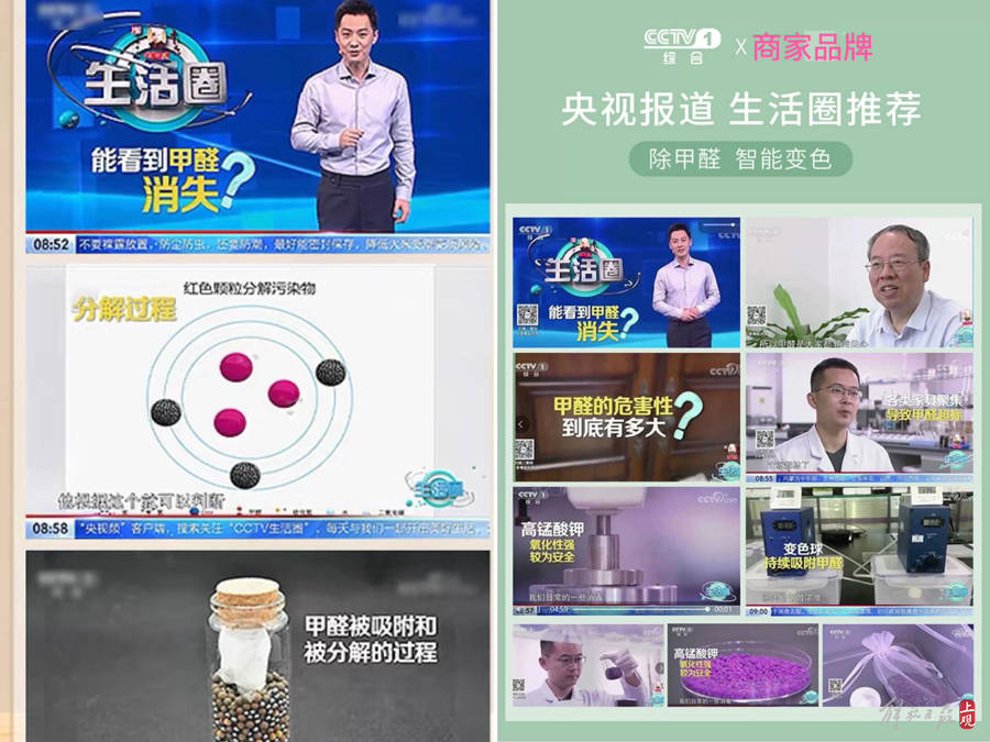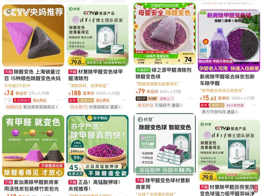 市民黎先生最近裝修,想上網買些去除甲醛的產品,發現很多商傢不約而同打出“央視推薦”“清華研發”的旗號。再看產品,都是紫色和黑色的兩種小球。商傢為瞭證明這些產品是“央視推薦”和“清華研發”,大多提供瞭電視節目截屏。截屏上確實有變色小球,並標註“甲醛被吸附和被分解的過程”。