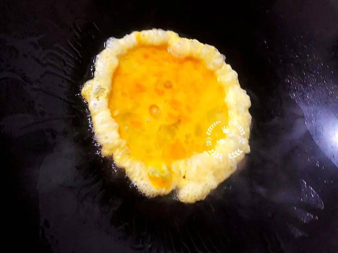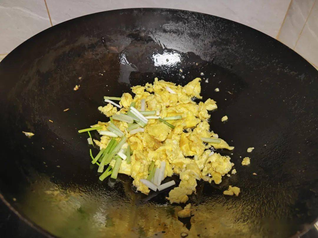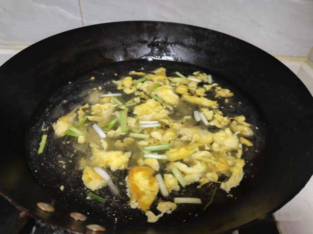 5.雞蛋液下鍋之後用小火煎煮給它煎煮至成塊,把雞蛋煎成塊後我們就放入備好的蔥白,稍微炒一下炒香。