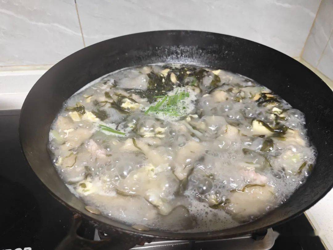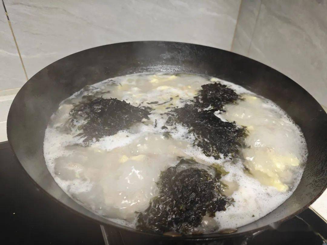 8.放入鍋中之後,我們就再用小火慢煮一下給它煮熟,煮好之後加入備好的紫菜,然後用筷子攪拌一下,給它攪拌均半年之後。
