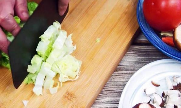 接著,將雞蛋打入碗中,並用筷子攪打均勻。將香菇洗凈並切成丁狀,生菜和西紅柿也切成丁狀,小蔥切成蔥花備用。