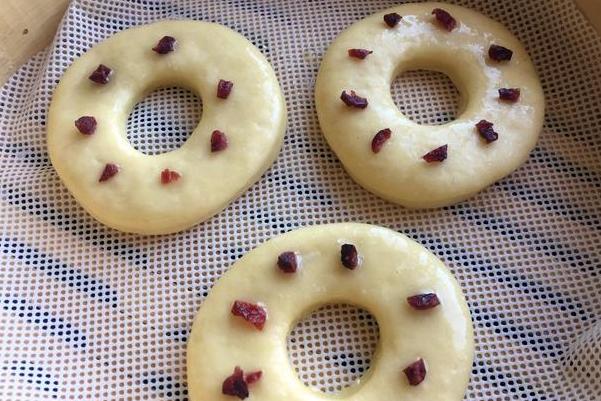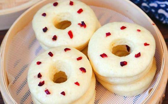 將山藥圈面胚放入蒸籠中,加蓋二次發酵。約20分鐘後,山藥圈明顯發酵膨脹,可在表面抹上蜂蜜水(蜂蜜水的比例為1:1),然後切碎適量的葡萄幹,壓在山藥圈上。