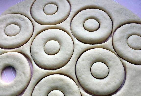 然後,將面團搟成0.5厘米厚的片,並使用模具將其壓成圈形。如果沒有模具,可以使用杯蓋或其他替代品。
