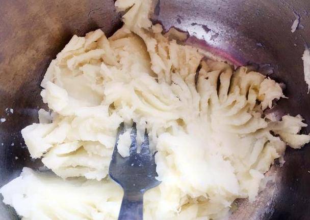 將蒸熟的山藥放入一個容器中,用不銹鋼勺子將其壓成山藥泥備用。接著,將20克白糖加入山藥泥中攪拌均勻。待山藥泥的溫度降至約30-40℃時,加入幹酵母、打入雞蛋並攪拌均勻。