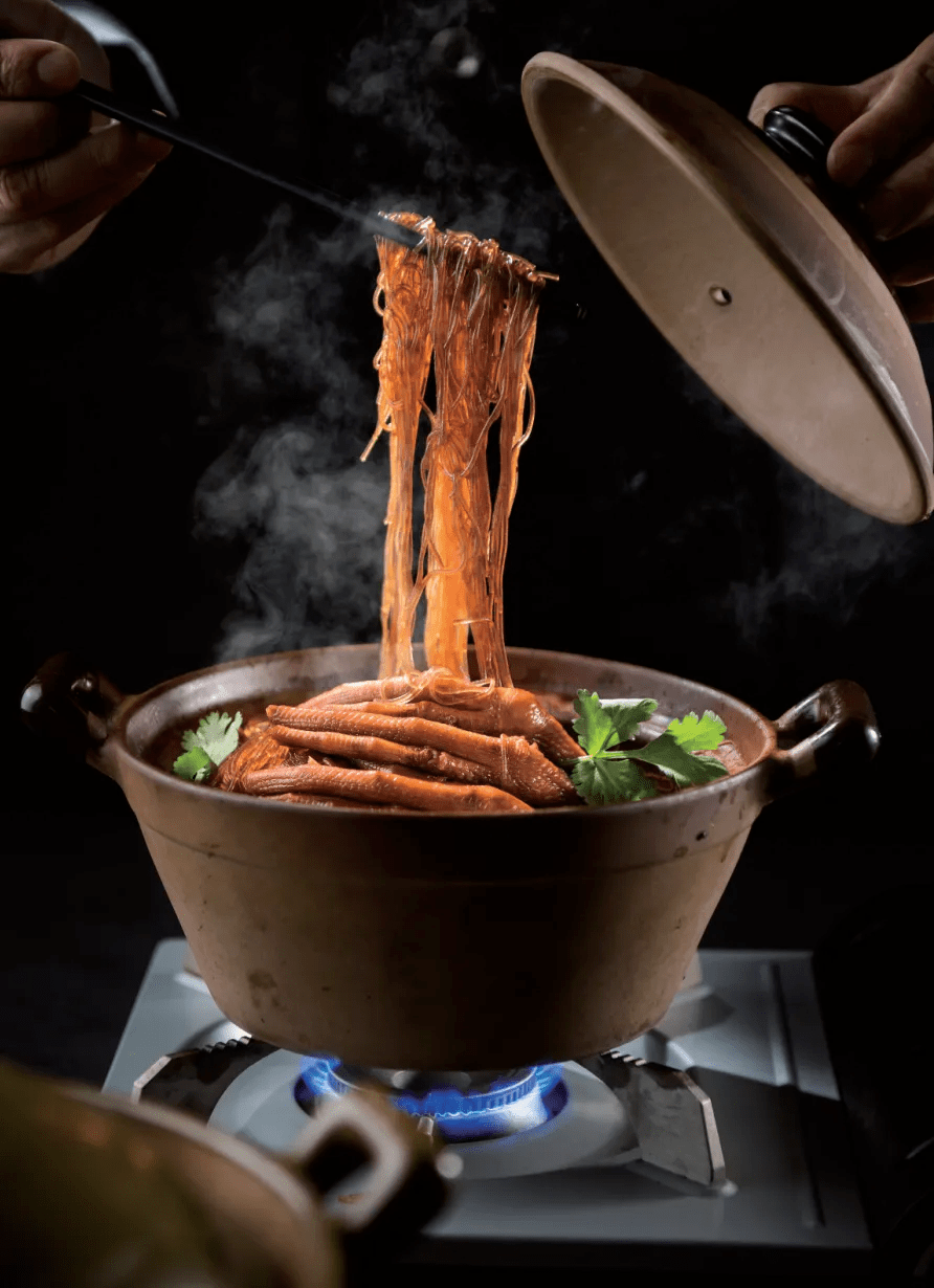 制作此菜分鹵、煲、撈三步,醬香獨特,鵝掌較厚蛋白質含量豐富,粉絲軟糯入口彈牙,香醇濃厚。