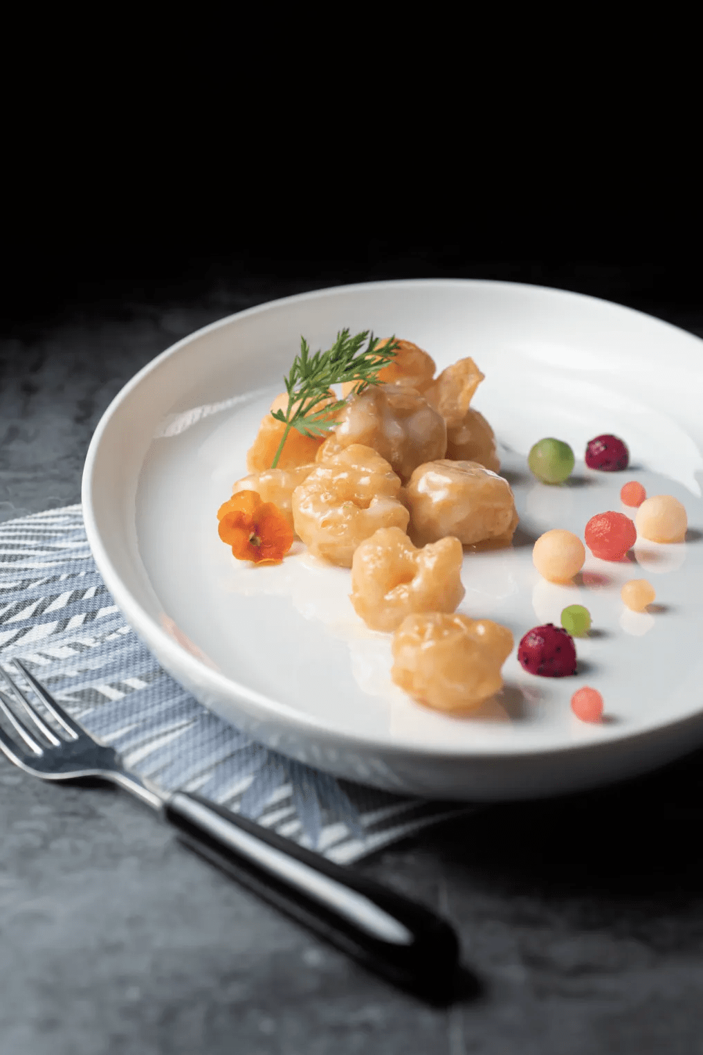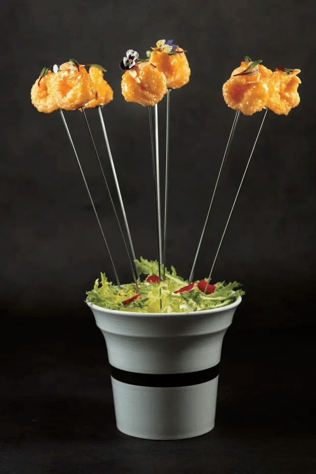 此菜根據沙拉蝦創新而來,蝦肉先裹上天婦羅粉油炸,再裹上青芥蜂蜜醬,外酥裡嫩,口感Q彈不油膩。成菜有兩種呈現方式,可直接擺盤造型,也可用凈鐵簽穿上炸好的蝦肉,插在花瓶盛器中。