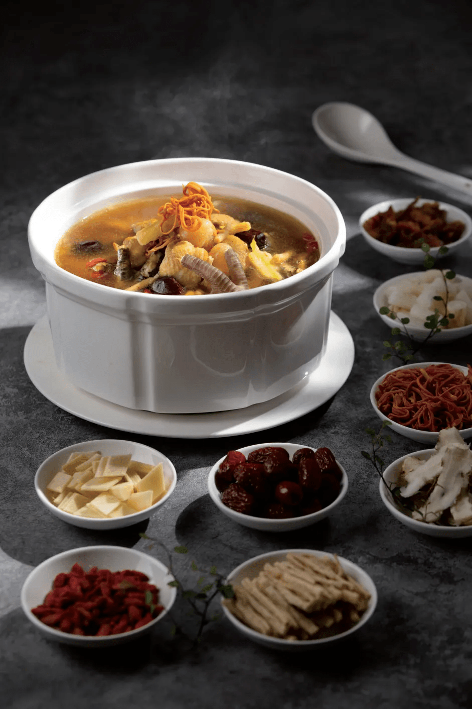 2.鍋內加適量清水,放入雞肉塊和桂圓肉、大棗、枸杞、蟲草花、黨參等滋補食材燒開,用小火燉120分鐘至肉,放鹽調味即成。