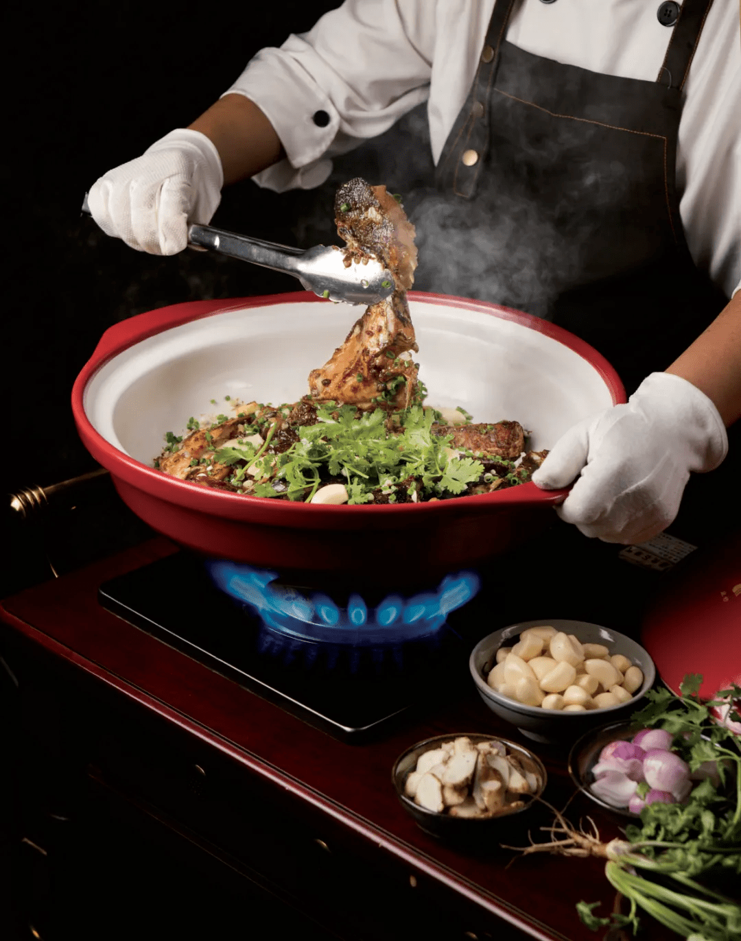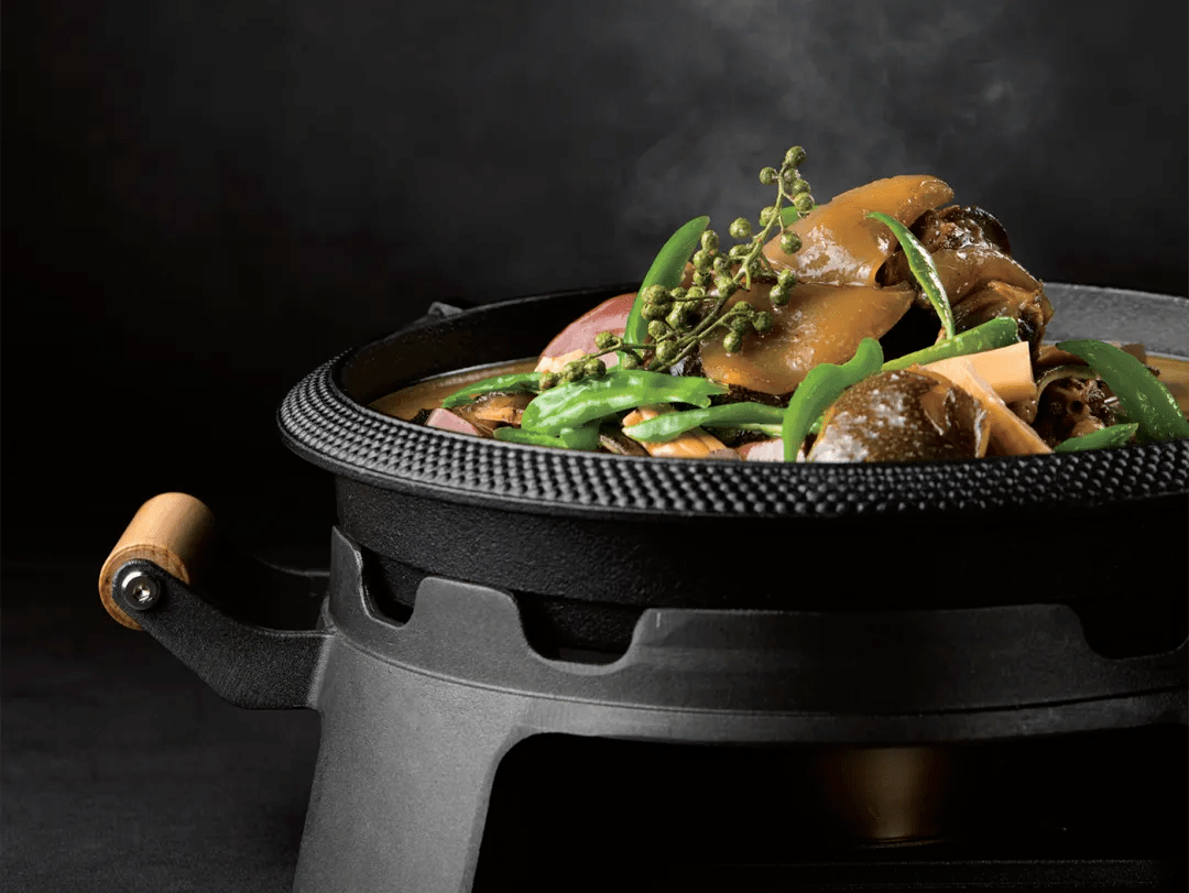 這是一道堂烹菜,嫩牛肉與溫泉蛋融合,口感更嫩滑。精選牛裡脊肉片用砂鍋焗至五分熟時,磕入雞蛋,上桌後點火稍焗,揭蓋攪拌,除瞭帶給人撲鼻的香味,還有新奇的視覺體驗。