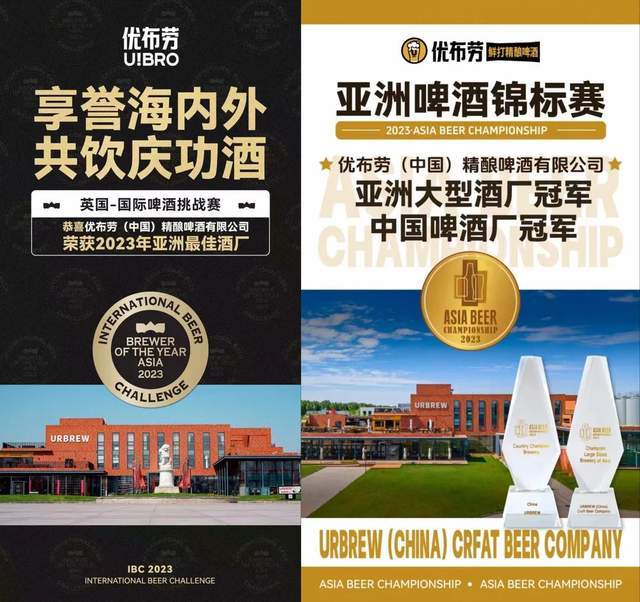 2023年優佈勞精釀生產基地分別獲得“國際啤酒挑戰賽(英國)-2023亞洲最佳酒廠”以及“2023亞洲啤酒挑戰賽-亞洲大型酒廠冠軍/中國啤酒廠冠軍”。