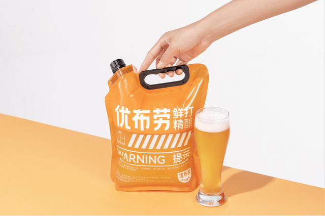 優佈勞開始采用食品級PVC塑料袋打酒,差異化明顯就出來瞭,用塑料袋裝酒,因為是透明的袋子,酒被打進去之後,能看到像果汁一樣渾濁的酒體,非常漂亮。甚至,當時優佈勞還花瞭很少的費用拍瞭一個廣告片,演員全部來自邯鄲的群眾演員。在這些方式嘗試之下,優佈勞的啤酒很快酒賣火瞭,復購率也非常高。