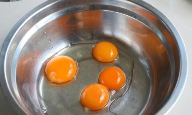 準備好的四個雞蛋中取出三個,打開,將蛋黃與蛋白分離,隻用蛋黃;然後將剩下的全蛋和三個蛋黃放入容器中。
