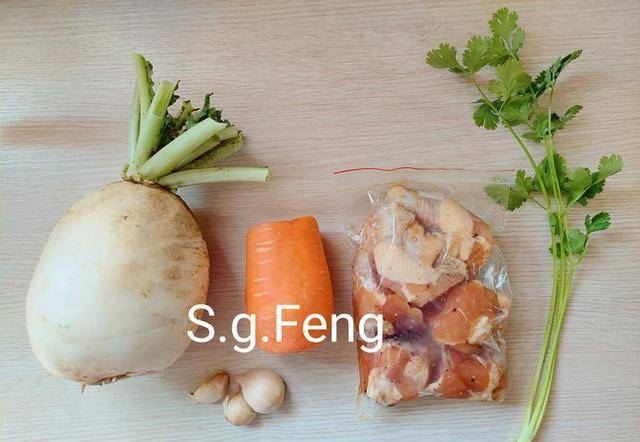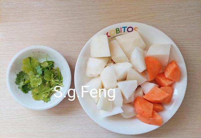 食材:雞翅腿(小翅腿)330g、白蘿卜(去皮重)0.5條(400g)、紅蘿卜1/4條、香菜或青蔥1根
