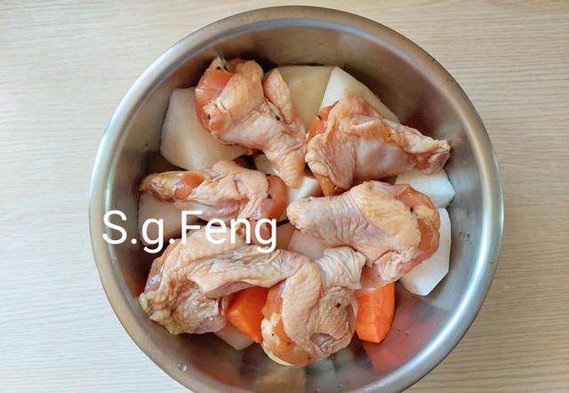 接下來,將醃漬好的小翅腿和蘿卜一起放入電鍋中。當令的蘿卜口感軟嫩鮮甜又多汁,而且不需要加入一滴水,因為蘿卜本身含有大量的水分。隻需要加入適量的鹽和味精等調味料,然後按下電鍋的開關,讓電鍋開始燉煮。