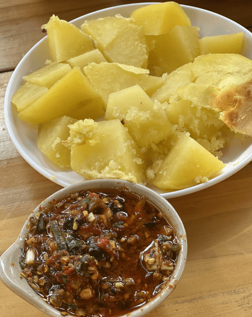 烤香的豆腐蘸上各式佐料特調的蘸水