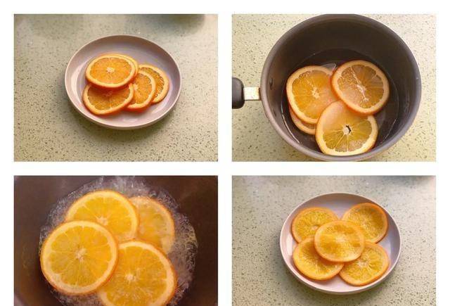 1、將買來的橙子用鹽洗凈。一定要用鹽仔細擦拭表面。這樣可以去除橙皮的苦味和皮上的蠟質。將橙子去皮,切成半厘米左右的片。將切碎的橙片放入鍋中,加入130克水和15克糖,用大火煮至橙片邊緣透明,撈出瀝幹備用。煮橙片的水不要倒掉,因為稍後還會用到。這裡需要註意的一點是,煮橙片時,要用小火,慢慢煮,直到邊緣變成半透明。切的時候不要切得太粗。太厚會影響搟蛋糕時的美觀。