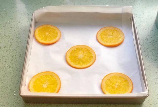 3.烤盤上預先鋪上油紙。在倒入蛋糕糊之前,將煮熟的橙片放在烤盤上。具體的排列方法是在四個角放置一片,最後在中間放置另一片。將混合好的蛋糕糊從高處倒入烤盤中,用刮刀將表面抹平,並敲擊幾下以消除大氣泡。烤箱預熱160度,150度烤25分鐘左右。烘烤完成後,將蛋糕取出並晾幹,直至手中感覺溫暖。然後卷起來。如果想吃餡的,可以抹上奶油或者果醬,卷起來。做好後最好先放入冰箱冷藏半小時凝固後再切片食用。