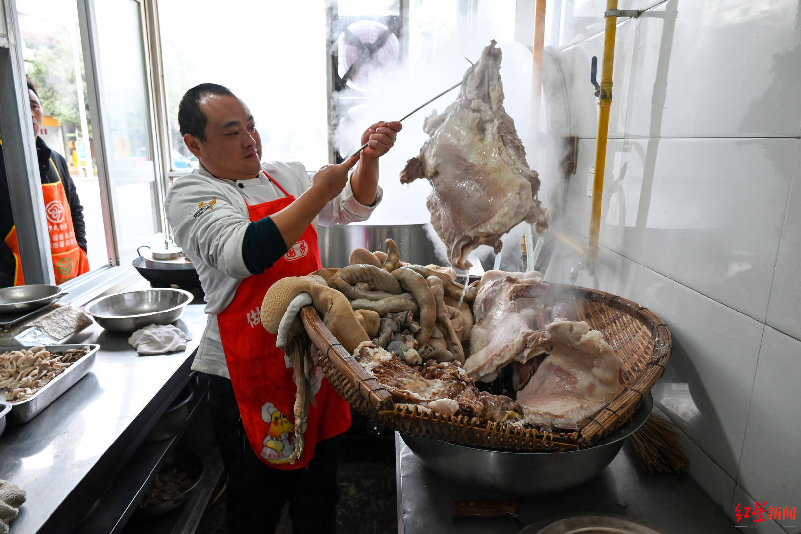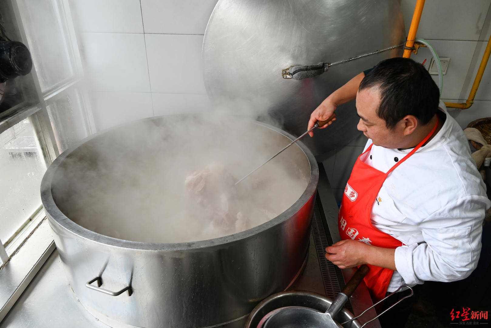 鄭兵在羊肉湯館幹瞭有18年,每天凌晨,都要為當天店裡的羊肉湯做準備,他比誰都熟悉熬羊肉湯的操作。