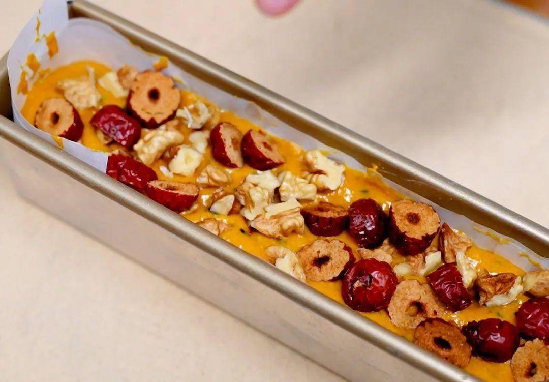 倒入鋪好油紙的模具中。表面撒上核桃、紅棗碎。