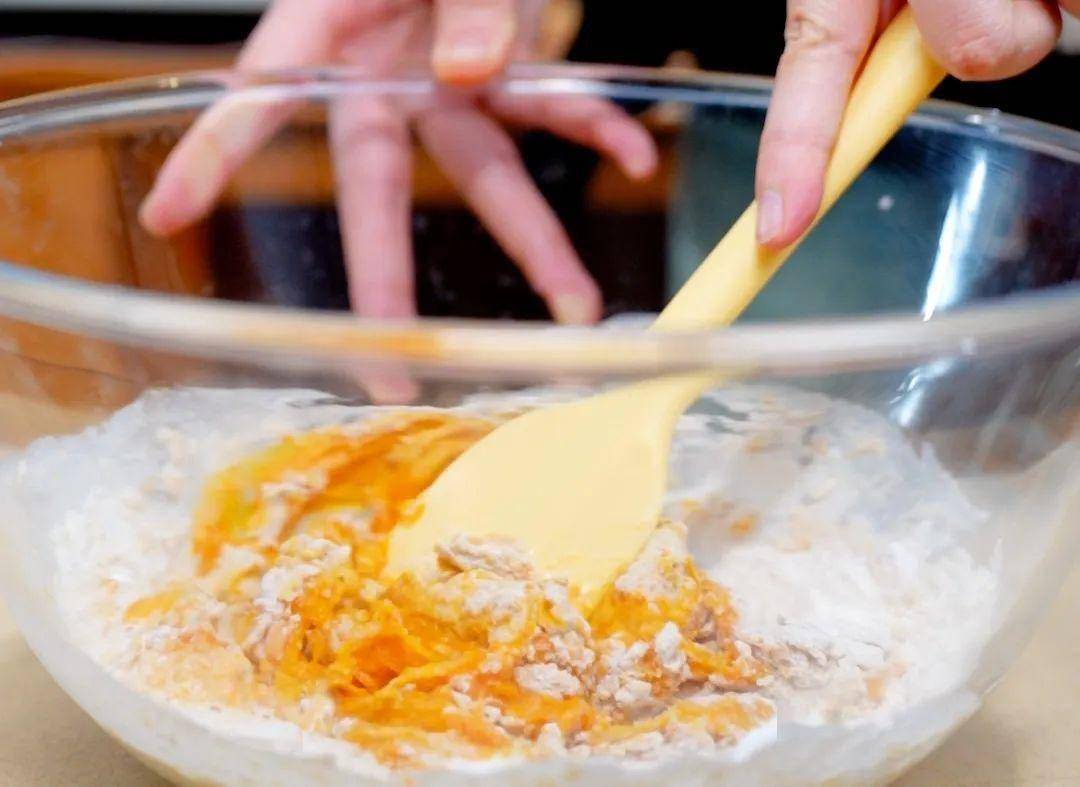 將全麥粉、南瓜泥、雞蛋、泡打粉、牛奶混合均勻。