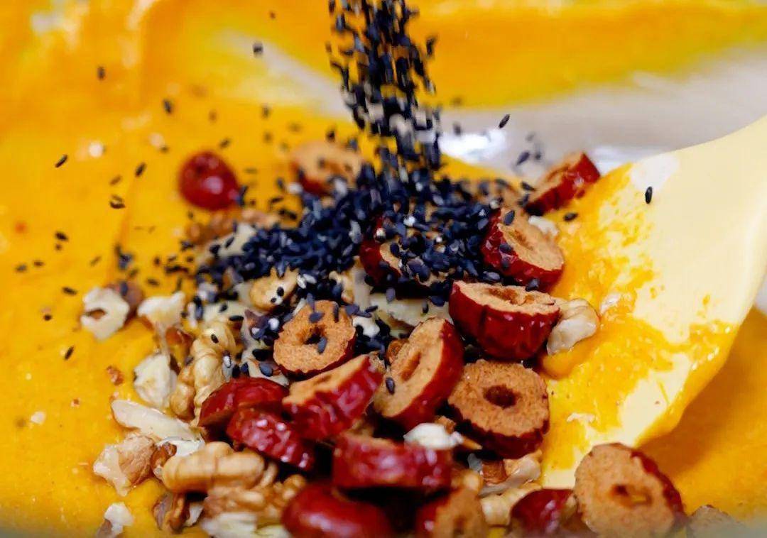 加入核桃仁、黑芝麻、紅棗攪拌均勻。