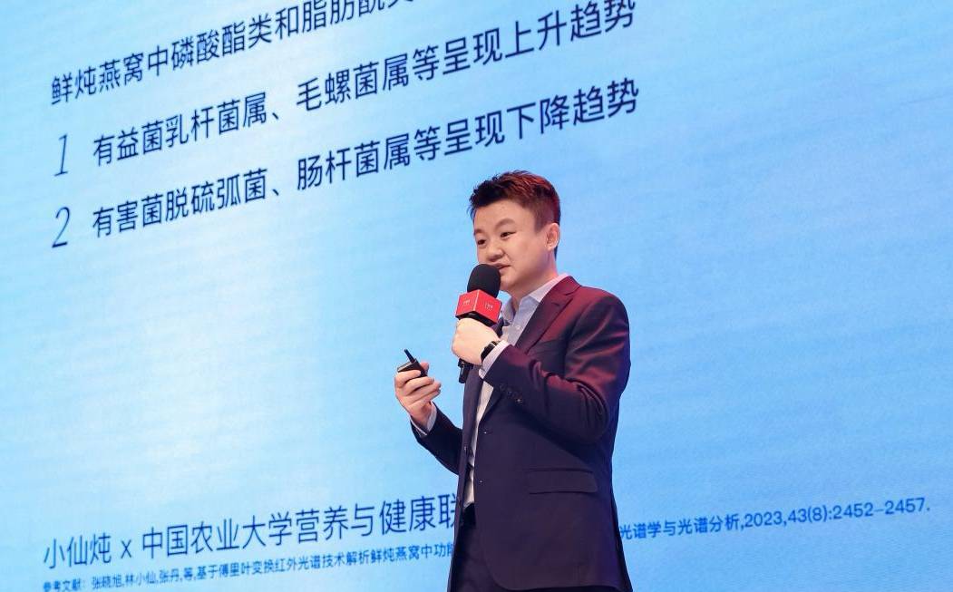 發佈會上,小仙燉首席科學官王東亮系統介紹瞭科研戰略的具體內涵,並分享瞭在科研戰略引領下的各項突破性科研成果,重點發佈瞭燕窩在皮膚、腸道、子代大腦發育、免疫力等六大方面的重要健康價值。據介紹,小仙燉攜手山東大學、中國農業大學率先開展燕窩的相關成分研究。研究表明,除瞭大傢比較熟悉的唾液酸之外,在燕窩中還發現瞭LOXL3和MUC5AC等關鍵蛋白,此外還有1000多種小分子,60餘種低聚肽和10餘種活性因子。小仙燉聯合中國農業大學營養與健康聯合實驗室研究發現,服用鮮燉燕窩後腸道菌有益菌呈現上升趨勢,有害菌呈現下降趨勢,燕窩中的功能因子可以調控腸道菌群,充分證明食用燕窩可以調節腸道菌群,改善人體免疫。該研究成果成功收錄於SCI核心期刊《光譜學與光譜分析》。此外,小仙燉科研團隊聯合山東大學、中國檢驗檢疫科學研究院也通過實驗進一步驗證:堅持食用鮮燉燕窩可以提高人體免疫力。實驗研究發現,低溫燉煮燕窩可以顯著增加體生成細胞數,提高腹腔巨噬細胞吞噬雞紅細胞的吞噬率和吞噬指數。高劑量組低溫燉煮燕窩還可以顯著增強碳廓清能力,提升NK細胞活性。此前,小仙燉先後公佈瞭其與中國農業大學院士團隊、日本齒科大學的科研成果,多項研究成果被國際知名SCI期刊收錄。小仙燉研發團隊聯合中國農業大學院士團隊研究發現,在孕期和哺乳期食用燕窩,對子代的大腦發育有很好的促進作用。而其聯合日本齒科大學的研究也進一步揭示燕窩對皮膚的健康價值。研究發現,食用鮮燉燕窩可以減少幹燥和紫外線對人體皮膚角質形成細胞和上皮細胞的有害影響和炎癥反應。
