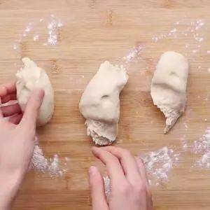 3、在案板上撒一些面粉(防粘),將醒好的面團放在案板上,揉成長條狀,然後將面團分成均勻的3份。