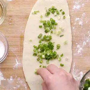 小貼士:為瞭防粘,搟的時候可以撒適量面粉。鹽和蔥花的量要根據個人口味來放。