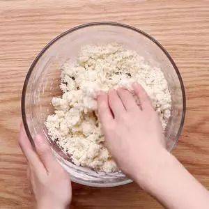 2.面團一開始會比較粘手,基本攏成團就可以瞭,不必揉至光滑,可以放一旁醒一會兒再揉一揉。