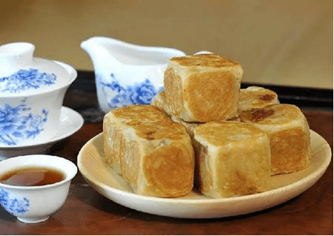 有一天,老師傅吃飯時,吃到一小塊腐乳,眼睛一亮,觸瞭心竅,丟下飯就往鋪裡跑。一進鋪,忙叫財主趕快買紅腐乳、大蒜頭和陳酒等物。他馬上動手,按那次賭氣的辦法調餡,做出來的餅,又有那股異香,一上市顧客又爭相購買,糕餅鋪的生意興旺起來瞭。
