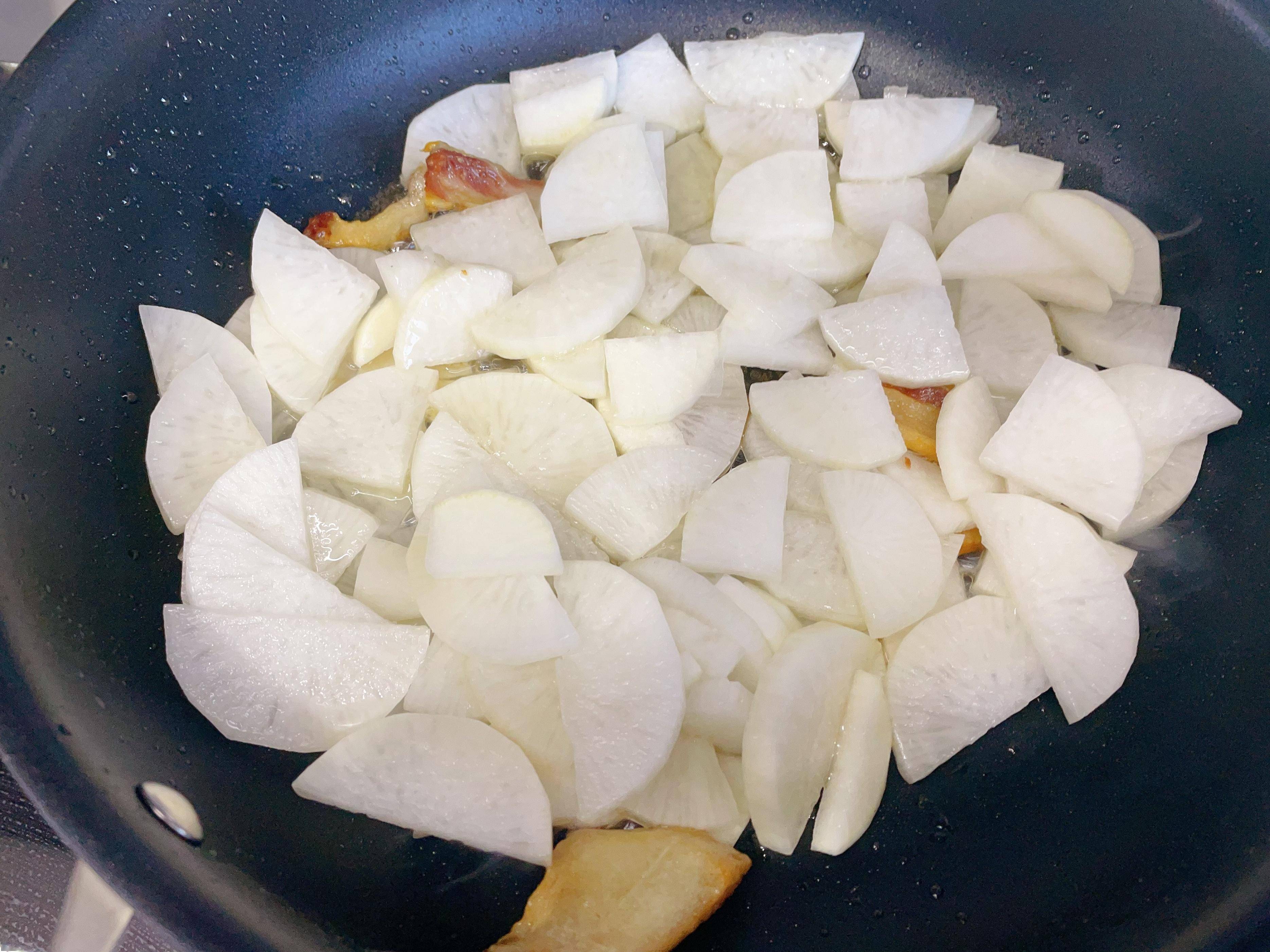 3、切好的蘿卜倒進鍋裡,翻炒均勻,等蘿卜開始變透的時候加一點蒜片增香,再倒入適量的醬油、糖、鹽和一點點的火鍋底料調味,翻炒均勻,炒到蘿卜上色,加適量的清水,蓋上蓋子燜制片刻;