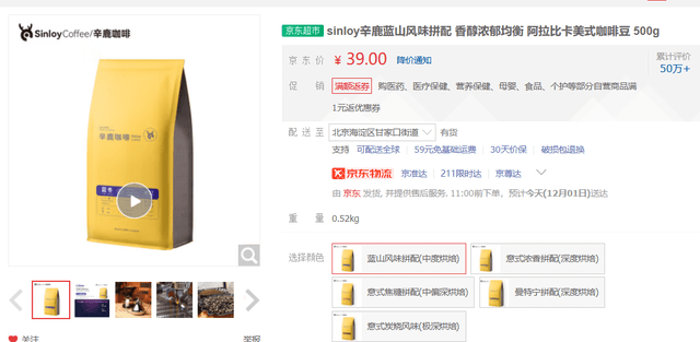 從京東超市目前在售的雲南咖啡為例,很多產品價格相當實惠,比如已經累計銷售超50萬件的藍山風味中度烘焙的雲南原產阿拉比卡咖啡豆,500克隻需要39元。