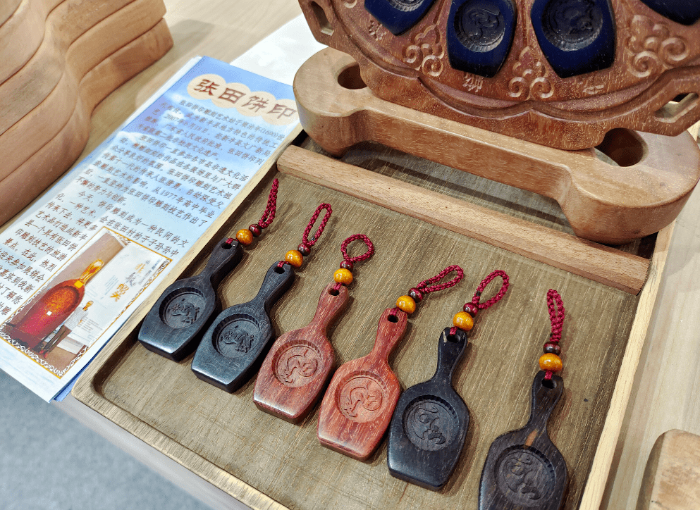 張田餅印,餅印又稱餅模,明末清初,由張田村張姓祖先所創,世代相傳。十二生肖餅模鎖匙扣是《張田餅印》經傳承人延伸、創新的文創產品,將十二生肖餅模鎖匙扣以鎖匙扣的形式進行呈現,把個頭小而栩栩如生的十二生肖圖案雕刻進小餅印。2020年榮獲第五屆廣東省非物質文化遺產創意設計大賽優秀獎。