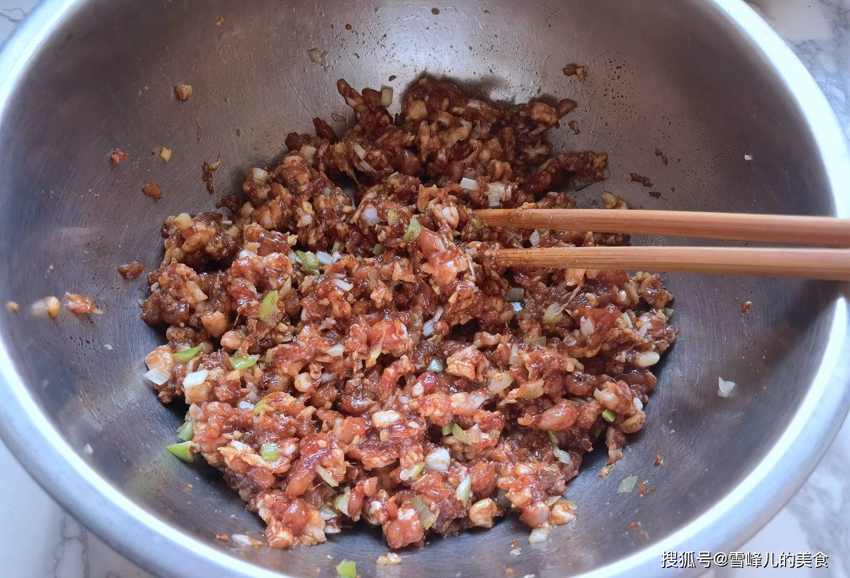 第五步:最後把處理好的雪菜末放入肉餡中,用筷子充分的攪拌均勻,餡料就調好瞭。