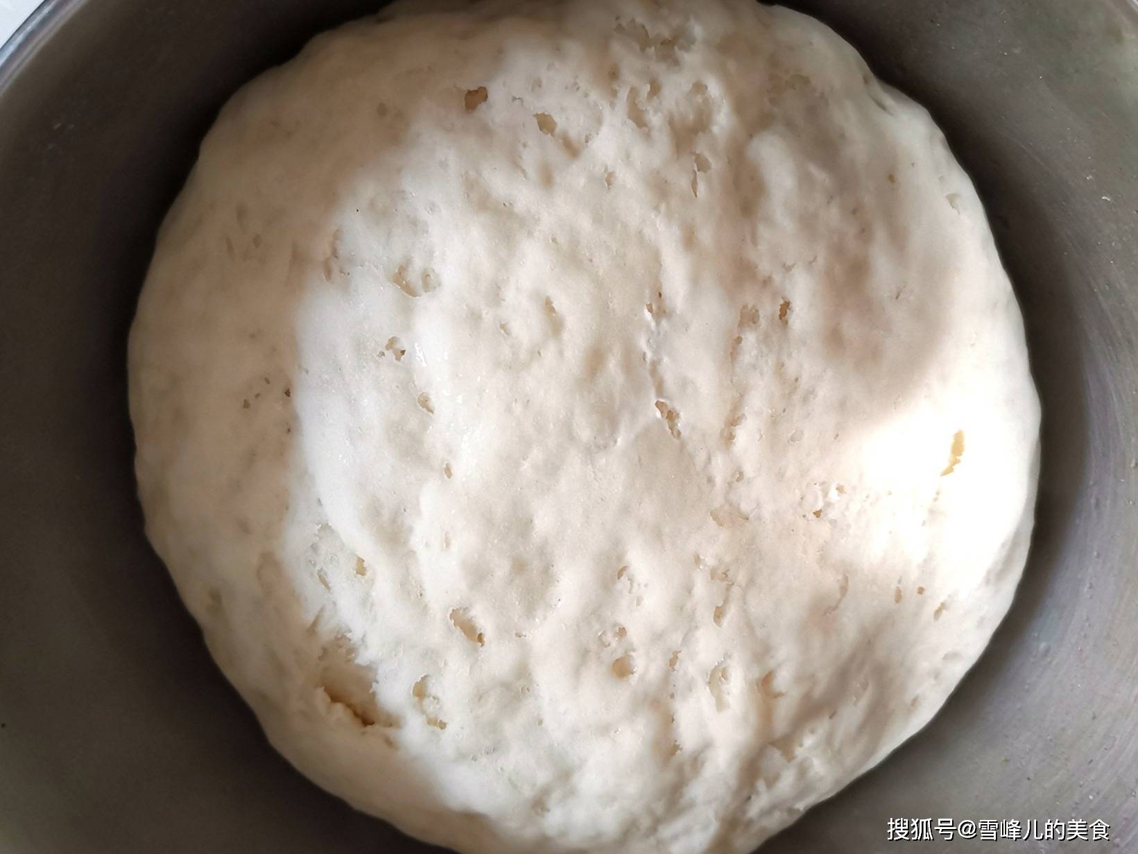 第六步:酵母粉用溫水融化倒入面粉中,揉成稍微軟一點的面團,蓋上保鮮膜靜置一會兒發酵成蜂窩狀。蒸包子發酵面團是必須的,發酵好的面團成蜂窩狀。