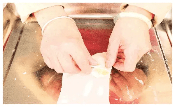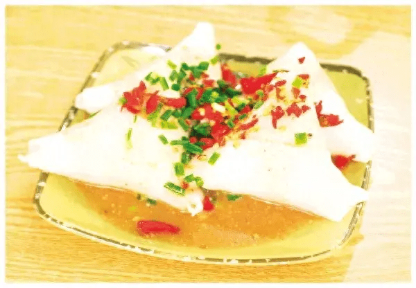 隻見莫小鳳將浸泡整晚的大米取出,瀝幹水分,倒入攪拌機中,將米和水以1:2的比例打成米漿。取一個托盤,刷上花生油,淋上薄薄一層米漿,放入鍋中隔水蒸2至3分鐘。蒸熟後,將米皮靜置放涼,寬寬的米皮,用小刀裁成約8厘米寬的米皮條,就可以制作蘿卜餃瞭。挖一勺餡料,放置在米皮上,斜向包成三角形,折疊4下,僅需三四秒,就完成瞭蘿卜餃的制作,十分簡單易學。“吃的時候再蒸3到4分鐘就好瞭。”莫大姐說。