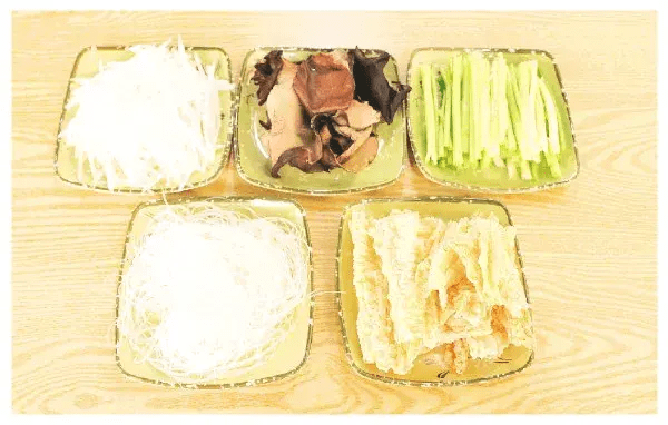 接著,莫大姐開始“揭秘”,她將已經準備好的食材擺上桌面:粉絲、蘿卜、木耳、芹菜、豆腐皮,這就是蘿卜餃的餡。然後將食材全部放入鍋中焯水斷生,即可撈出,用少許食鹽調味,將所有食材放入盆中,抓拌均勻,餡料就做好瞭。