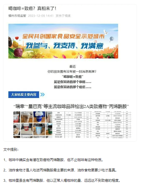 同一天,福州市場監管局發文稱,丙烯酰胺不是咖啡豆本身的成分,也不是人為添加的,而是在烘培過程中自然出現的。目前我國暫未對咖啡中丙烯酰胺有限制性或禁止性規定。文章同時表示,丙烯酰胺並非咖啡所獨有,淀粉類食物在燒烤油炸時或多或少會產生,少量的丙烯酰胺不會對人體造成影響。